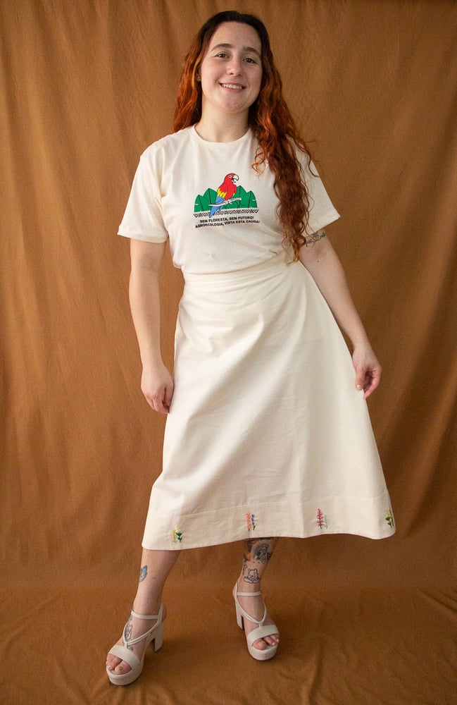 Na cor natural, a peça une conforto, consciência ambiental e compromisso social: cada camiseta é resultado da rede solidária da Justa Trama, que envolve agricultores, fiadoras, tecelãs e costureiras em um trabalho coletivo e digno.