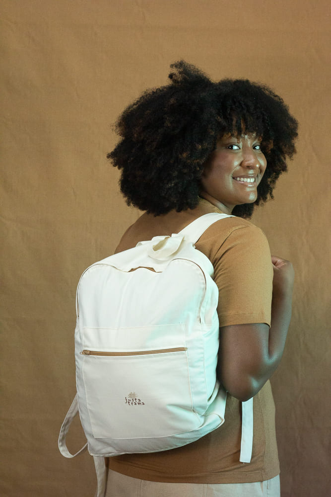 Mochila grande em sarja crua de algodão agroecológico, resistente e atemporal, ideal para acompanhar sua rotina com estilo e consciência. Ao escolher esta peça, você fortalece toda a cadeia da economia solidária da Justa Trama — do cultivo sem agrotóxicos ao trabalho coletivo de artesãs e costureiras que transformam a matéria-prima em produto sustentável.